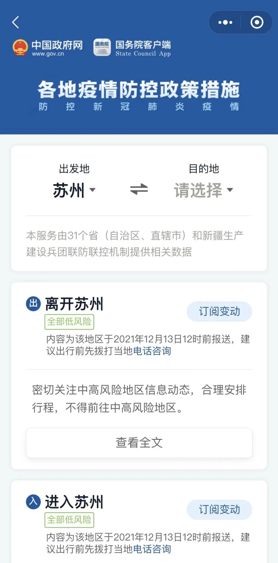最近要出門,不知道出發(fā)地、目的地都有什么疫情防控政策措施?別著急,兩步教你查詢!在“張家港發(fā)布”微信菜單欄打開“國務院客戶端”小程序,進入后搜索“各地疫情防控政策措施”,即可搜索查詢相關信息!