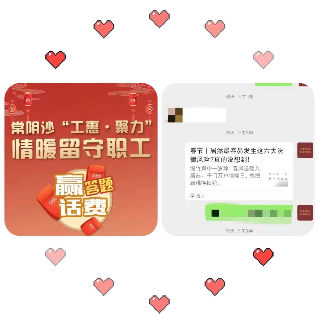 正月初一至初五常陰沙工聯(lián)會線上開展新春答題贏話費活動。通過微信群等推送“以案釋法”案例等方式,為留守職工宣傳“喝酒不開車,開車不喝酒”“喝酒需謹慎,勸酒須擔責”等春節(jié)期間常見問題,同時也宣傳了疫情防控信息和知識。