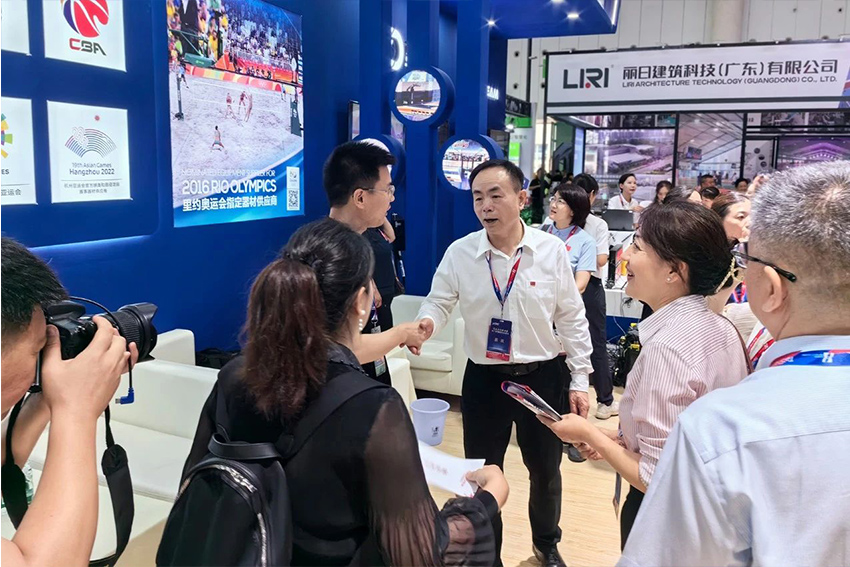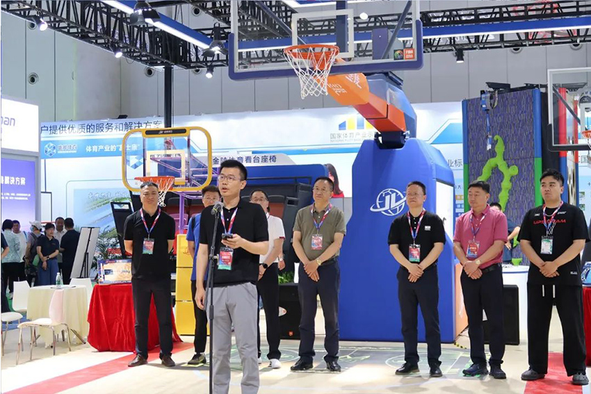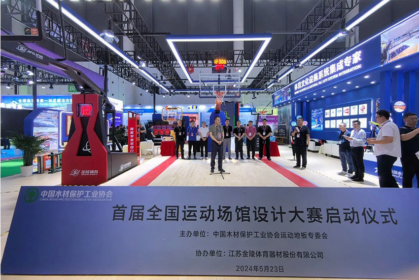 展會期間由中國木材保護工業協會運動地板專委會主辦的首屆全國運動場館設計大賽啟動儀式在金陵體育展位舉行,金陵體育總經理李劍剛出席并致詞。
