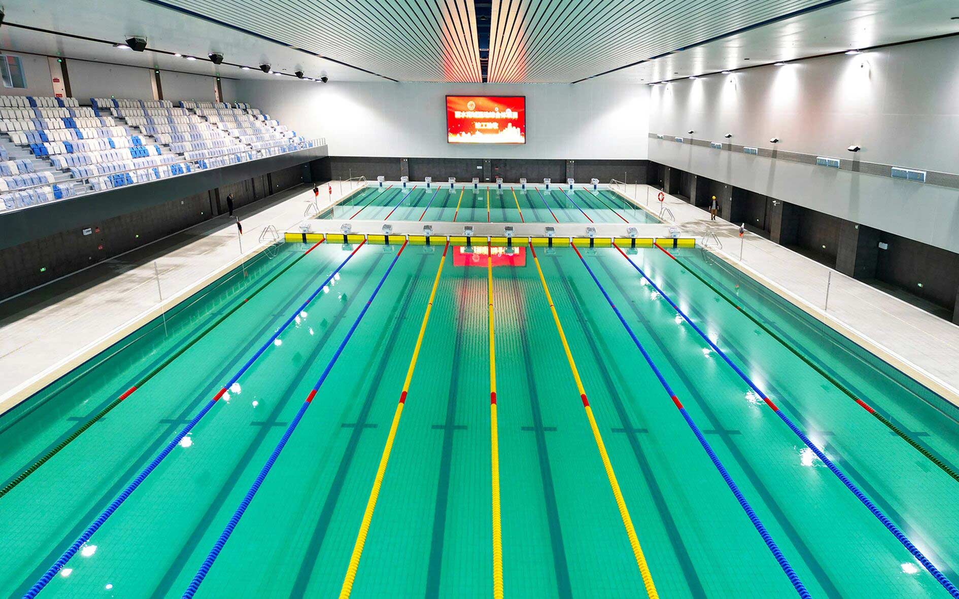 作為項目核心建設力量金陵體育承接了其中眾多關鍵的體育工藝內容,覆蓋所有室內場館、室外球場及體育場的全流程體育工藝工程。從場地擴聲和照明系統、LED大屏,到體育設施系統、各類體育器材、看臺座椅,再到運動草坪、跑道鋪設、泳池水處理、恒溫除濕系統等,每一個細節都傾注了專業匠心。